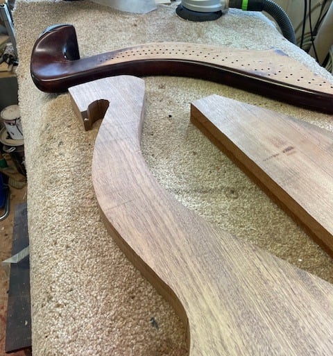 The model I make now has evolved quite significantly from the model I started out making. Initially I used a 5 stave back in poplar. Over time I moved to a round back shell, and my inspiration for the process of construction came from Rick Kemper of Sligo harps and Larry Fisher of Fisher harps.