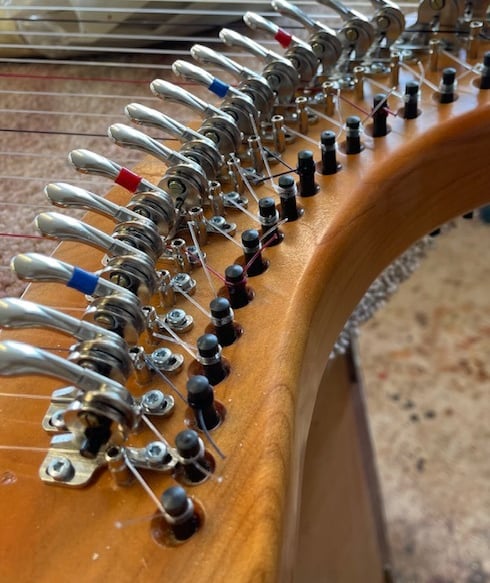 Designed for traditional players and classical players, my harps offer the big sound associated with concert harps. The carbon fibre strings from Alto A to 4th F are of a higher tension and gauge than most other harps. This puts enormous strain on the instument and consequently my harps have to be overbuilt to allow for this.
